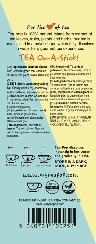 Hergestellt aus 100 % natürlichen Zutaten: Tee, Früchte, Pflanzen und Kräuter • Löst sich vollständig in heißem und kaltem Wasser auf • Einzelverpackt in praktischem Kissenbeutel mit Präsentationsständer Ideal als Geschenk, für Dinnerpartys oder zum Selbstverwöhnen. Einfach, lecker und spaßig – mit Tea-Pop genießen!