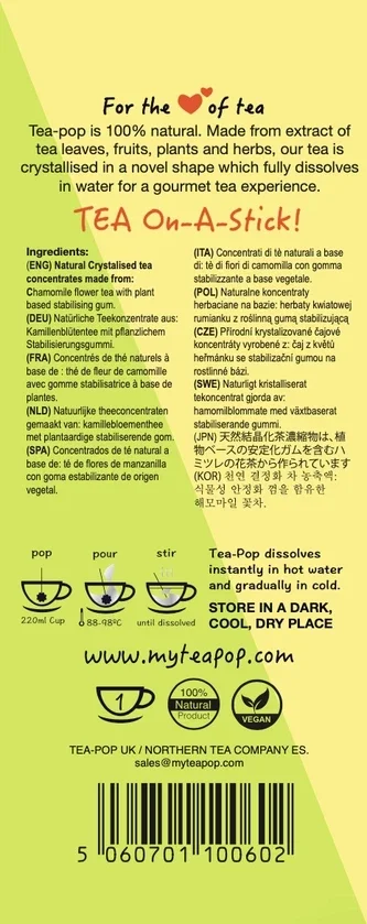Hergestellt aus 100 % natürlichen Zutaten: Tee, Früchte, Pflanzen und Kräuter • Löst sich vollständig in heißem und kaltem Wasser auf • Einzelverpackt in praktischem Kissenbeutel mit Präsentationsständer Ideal als Geschenk, für Dinnerpartys oder zum Selbstverwöhnen. Einfach, lecker und spaßig – mit Tea-Pop genießen!