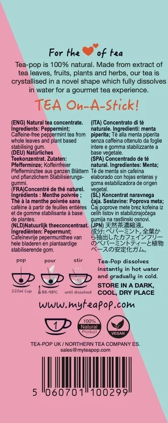 Hergestellt aus 100 % natürlichen Zutaten: Tee, Früchte, Pflanzen und Kräuter • Löst sich vollständig in heißem und kaltem Wasser auf • Einzelverpackt in praktischem Kissenbeutel mit Präsentationsständer Ideal als Geschenk, für Dinnerpartys oder zum Selbstverwöhnen. Einfach, lecker und spaßig – mit Tea-Pop genießen!
