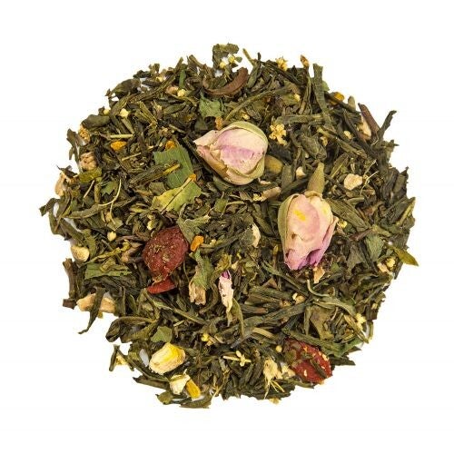 Zutaten: Grüner Tee China Sencha* (79%), grüne Minze*, Ingwer*, natürliches Cranberry Aroma, Gojibeere*, Kurkuma*, Rosenblüten*, Granatapfel*, Limettenöl*, natürliches Pfefferminz Aroma. *Aus kontrolliert biologischem Anbau.
