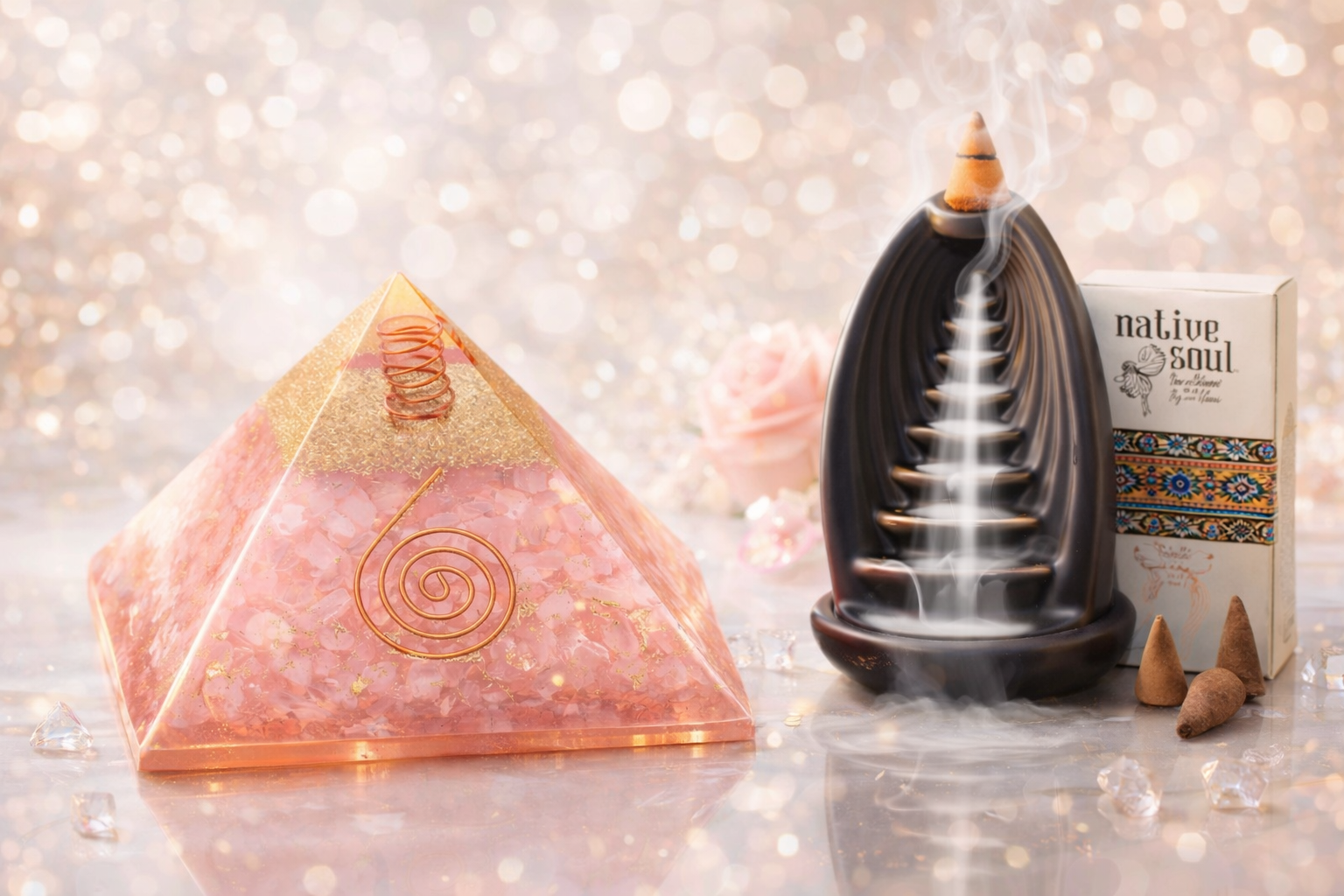Die Kombination aus Rosenquarz + Kupfer wird traditionell genutzt, um Räume energetisch auszugleichen und eine ruhige, harmonische Stimmung zu schaffen.